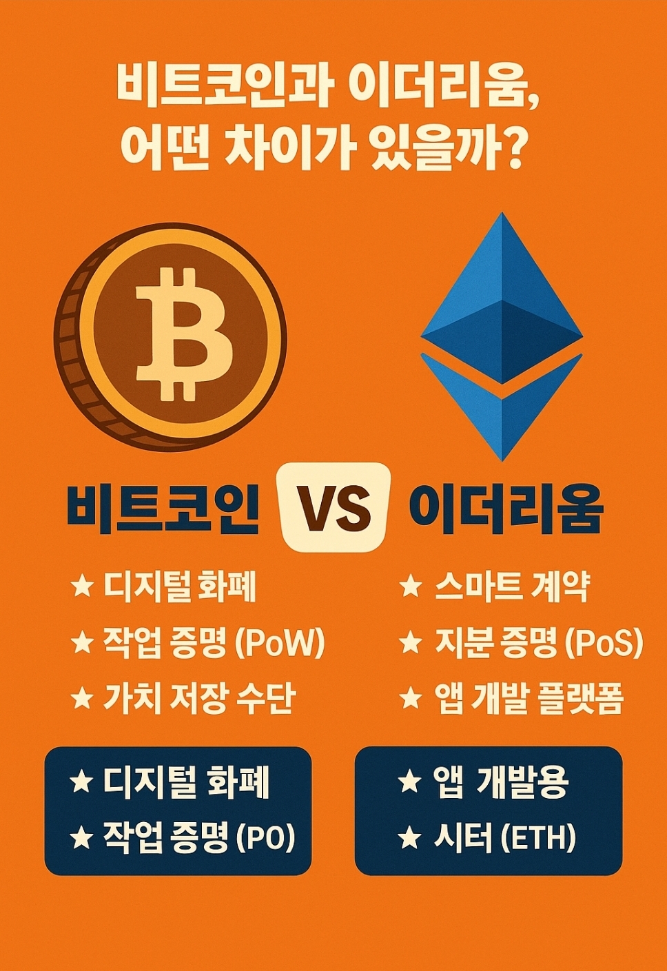 둘 다 블록체인 기반의 대표적인 가상자산이지만, 태어난 목적도, 사용하는 방식도, 쓰임새도 완전히 다릅니다.